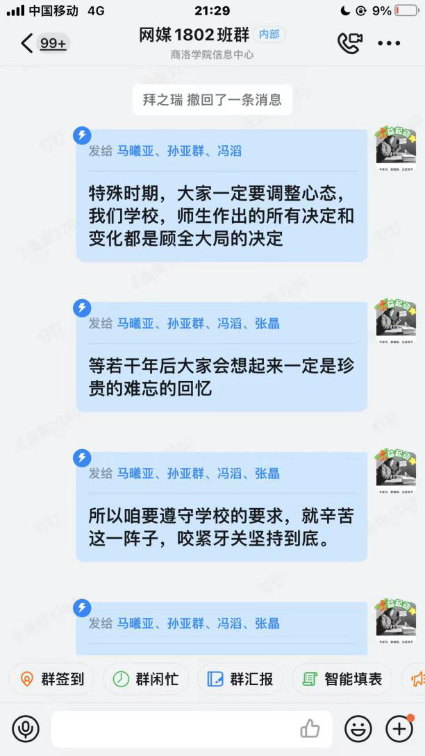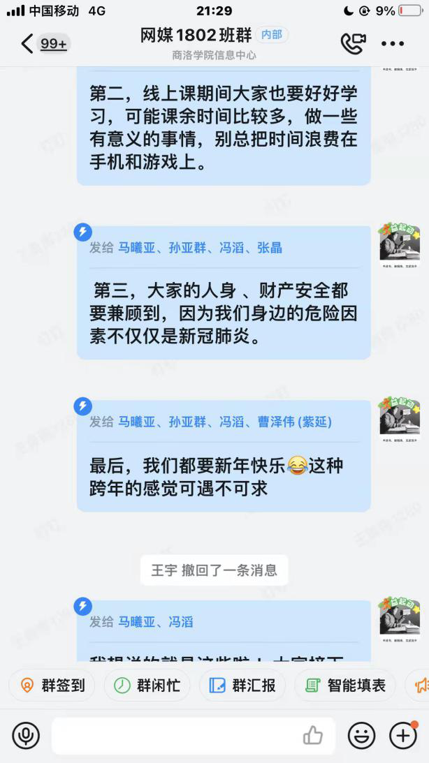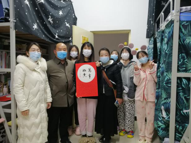 疫情无情,人文有情。院领导及学工人员向同学们致以新年祝福,希望同学们妥善安排好学习和生活,有困难及时反映。党总支副书记杜明生用手工挂历的形式为同学们送上了新年祝福同时耐心解答了同学们的问题,详细了解了同学们封校期间的学习和生活情况,叮嘱大家在疫情期间要做好防护。