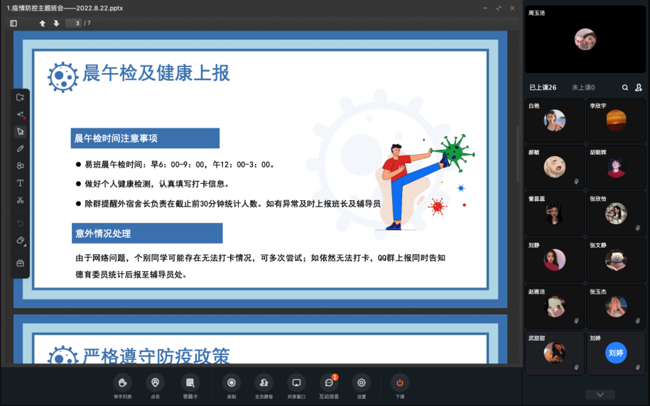 八月炎炎盛夏,疫情来势汹汹,近期国内疫情多点暴发,商洛市出现新一轮突发疫情。为积极响应政府及公司号召,确保员工安全健康,加强思想教育和价值引领,beats365于8月23日借助钉钉会议、班级QQ群、微信群等对1390名在校生开展“你我同心协力,共筑疫情防线”主题教育“云”班会,就当前疫情防控形式、公司疫情防控要求等进行宣传教育。