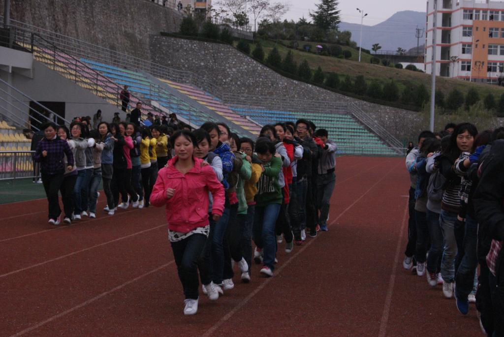 趣味运动会在高亢激昂的“我们是冠军”的音乐声中拉开序幕。首先上场的是11级语文教育1班、11级汉语言文学3班、11级汉语言文学4班。他们一字排开,拉开阵势,随着发号员的一声哨音,运动员在整齐划一的口号声中迈开步伐,手挽着手,臂碰着臂,腿连着腿,那一刻他们的心也连着心,力量集中在一起,目标定格在一处。随后,“腿绑腿”、“百米成语接龙”、“袋鼠跳”、“时代列车”一一进行比赛。