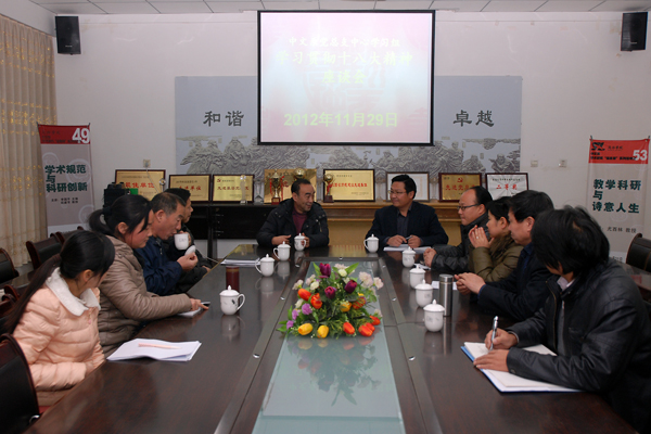 与会教师纷纷表示,党的十八大报告论述精辟、主题鲜明、重点突出、内涵丰富,是党的基本思想和基本理论的系统总结和全面创新,是全党智慧的集中体现。在今后的工作中,一定要以党的十八大精神为指导,深刻领会、学习、贯彻党的十八大精神;在教学工作中,要带头践行社会主义核心价值观,坚定政治信念,做到立德树人。