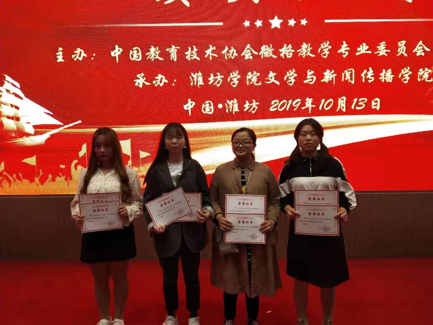 10月11日至14日,2019年语文微格教学论坛暨第九届“华文杯”高等院校师范生语文教学能力测试与交流展示活动在山东省潍坊公司举办。公司2017级汉语言文学专业4位参赛同学凭借良好的精神风貌和扎实的技能功底,荣获一等奖3项、二等奖2项、三等奖2项、优秀奖1项。
