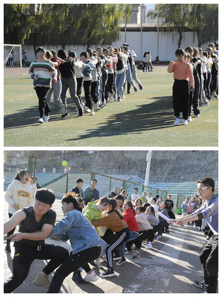 本次运动会由众志成城、爱的魔力转圈圈、幸运纸牌、时代列车和拔河比赛五个项目组成。这次趣味运动会比赛项目集趣味性、娱乐性、协作性和竞争性于一体,既是力量的角逐,又是智慧的较量;既是参赛队员风采的展示,又是对团队协作能力的检验,充分地调动同学们的积极性。