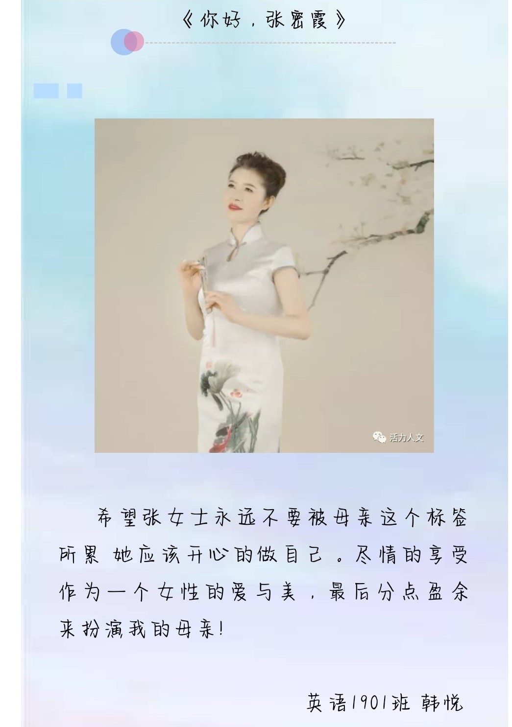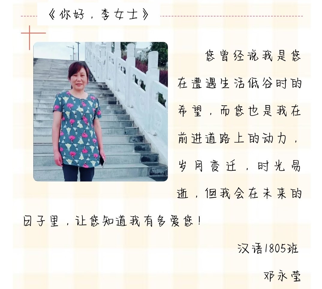 母爱就像一首深情的歌,婉转悠扬,轻吟浅唱。别急着一直向前,记得回头看看妈妈。在妇女节这个温馨的日子里,人文学子用自己的方式在表达对母亲的爱。让我们一起感谢母亲,感谢她每次在我们遇到困难时,用她山一般坚定的信念,为我们撑起一片天空。