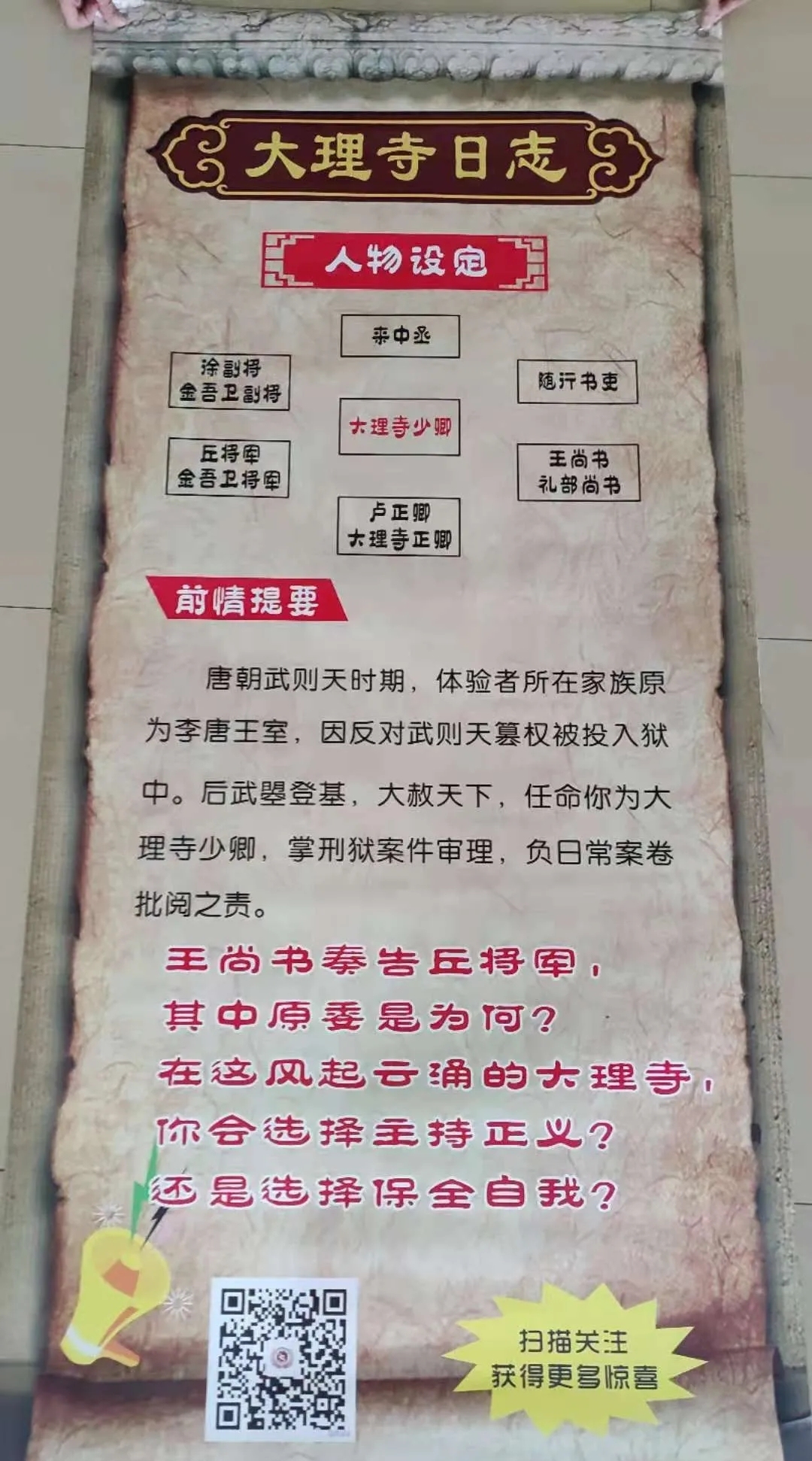 背景一:大理寺日志,唐朝武则天时期,官场勾心斗角,在政治大势面前,是选择一查到底,还是委曲求全明哲保身,一切因你而定。