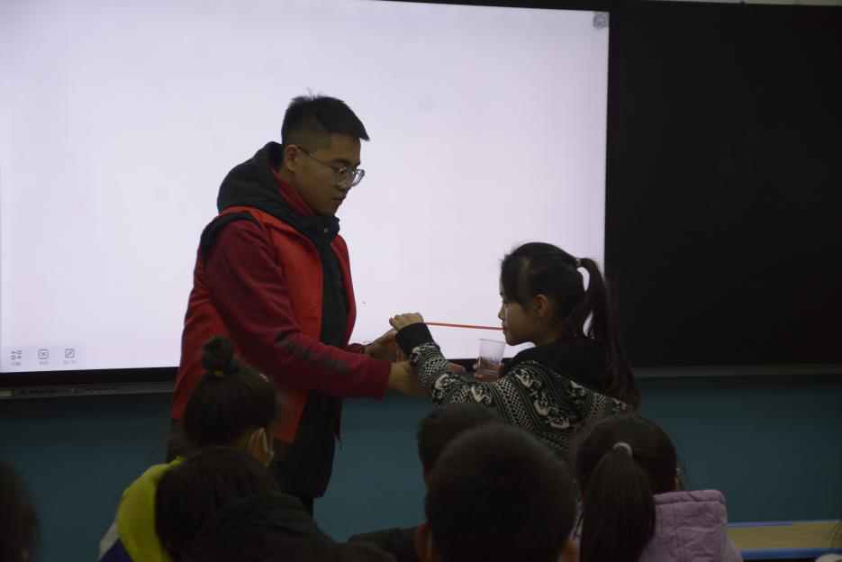 志愿者们用PPT、简单的纸杯、吸管等道具,为孩子们上了一堂精彩绝伦的科学实验课。在实验中让小朋友们充分了解了“虹吸效应”的原理。