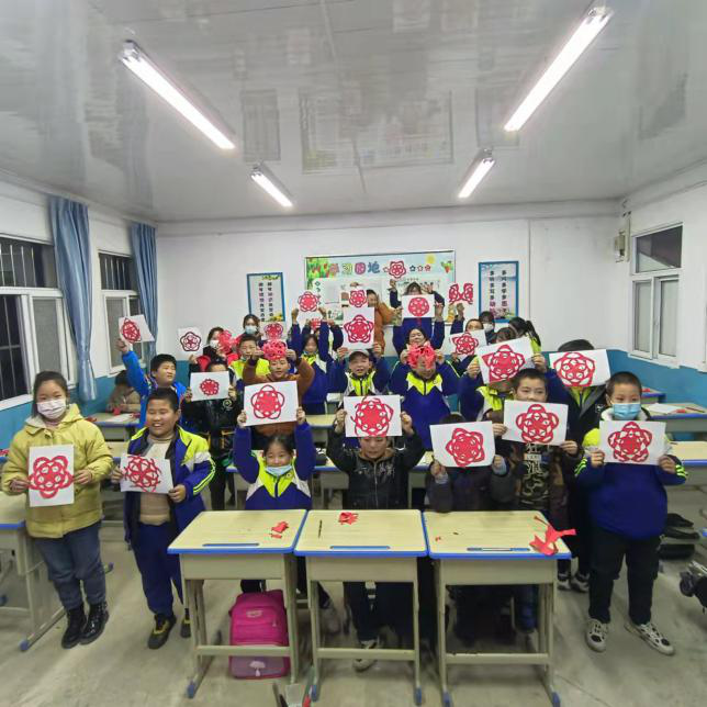 一张张彩纸,经过小朋友们的构图裁剪,变成一片片火红的绒花剪纸。在每一次的裁剪中提升了孩子们的动手能力与想象能力。