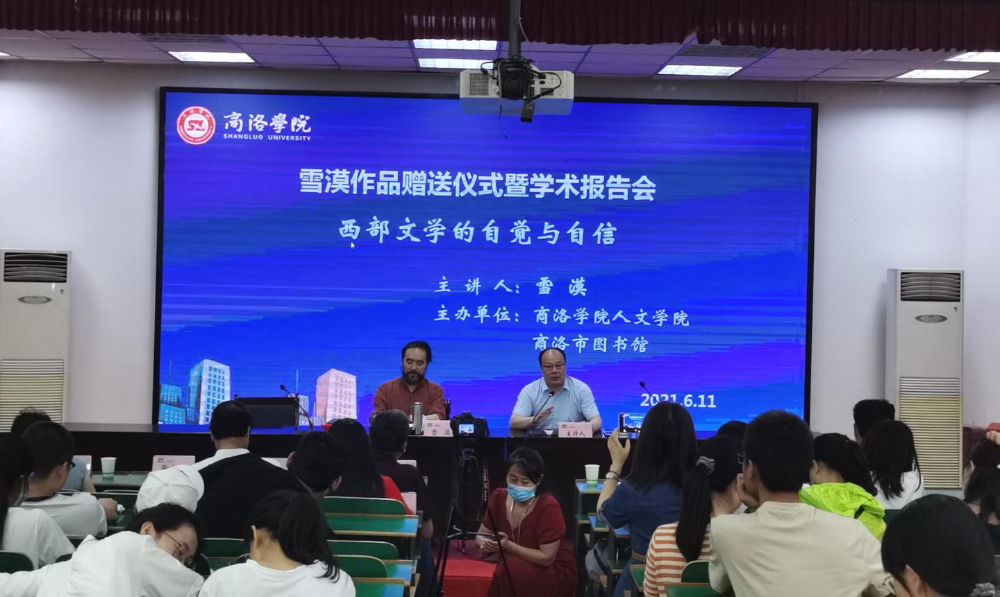 6月11日上午,公司与商洛市图书馆共同主办的“雪漠作品赠送仪式暨学术报告会”在公司1号楼报告厅二举行。会议邀请了国家一级作家、甘肃省作家协会副主席、中国作家协会会员雪漠为公司及商洛文联等受邀单位现场赠书并作学术报告,公司beats365经理、商洛文化暨贾平凹研究中心主任张文诺教授,图书馆馆长张国春,商洛市文联党组书记、主席王良,中国作协会员、商洛市作协常务副主席、商州作协主席王卫民,商洛市图书馆馆长彭萍莉,商洛职业技术公司图书馆馆长张维,商州区图书馆馆长席明及公司汉语专业百余名师生共同参加了会议。此次会议由公司副经理马英群主持。