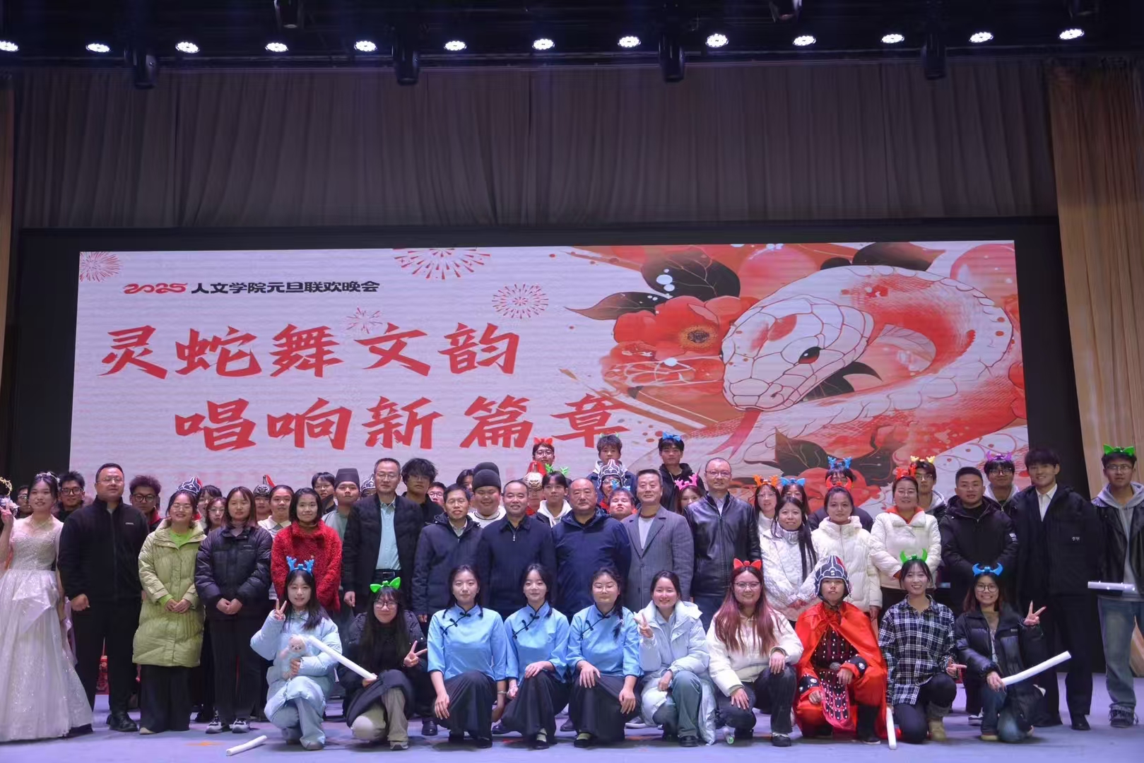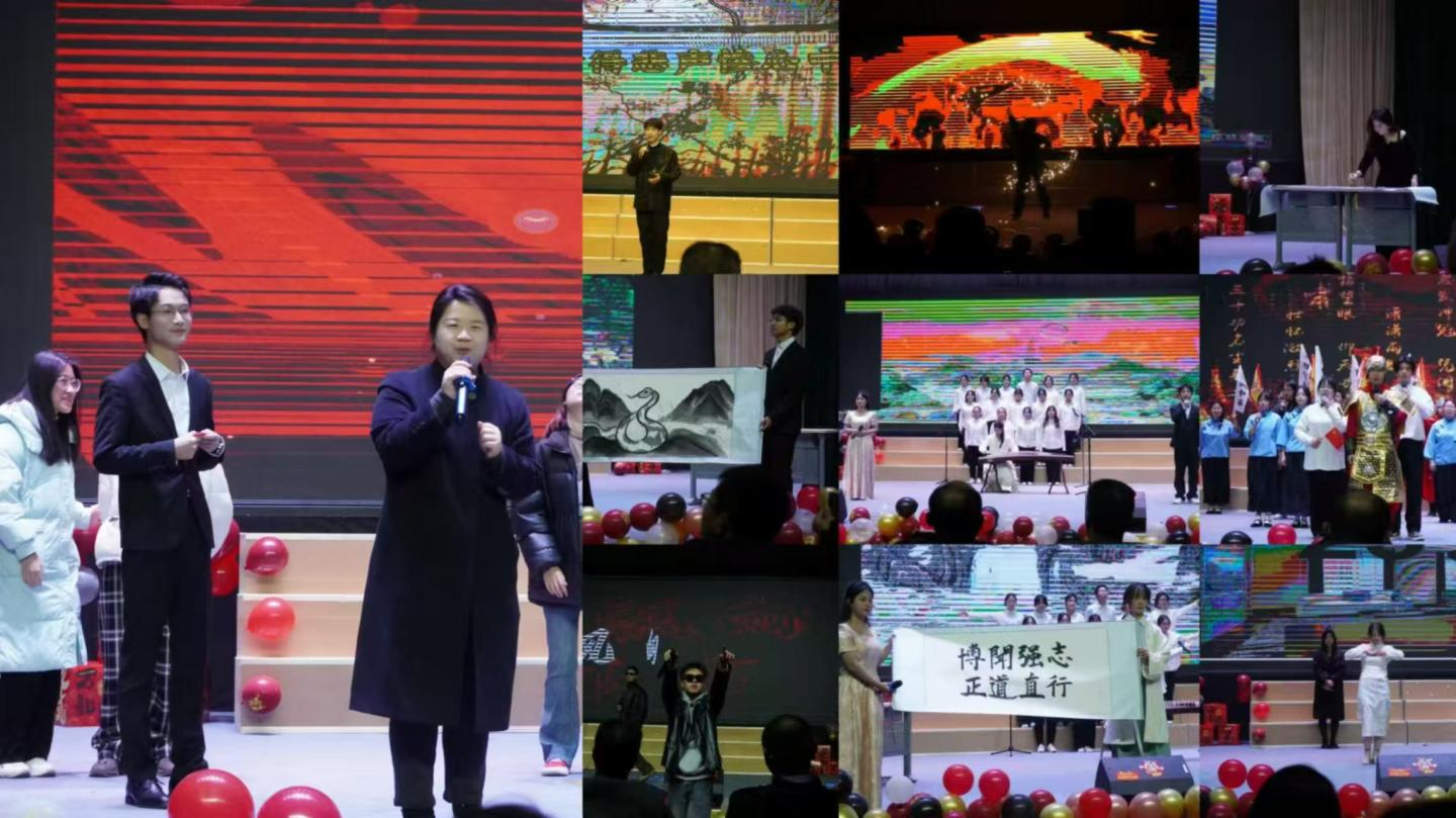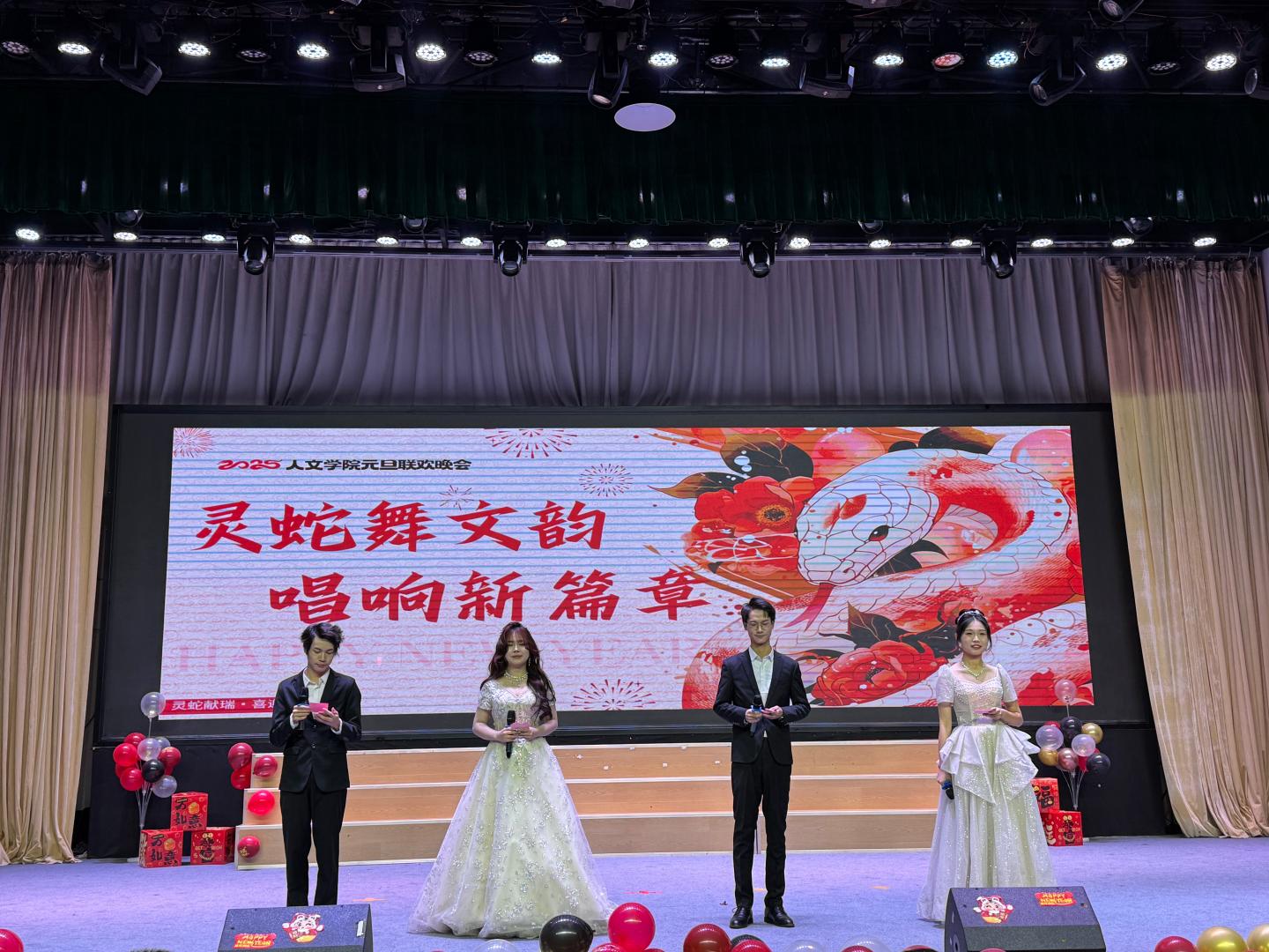 祥龙摆尾辞旧岁,灵蛇纳福迎春来。在时光的长河悠然游弋间,2025蛇年元旦的跫音悄然而至。为庆贺元旦佳节,beats365于12月19日晚在八号楼老员工活动中心盛启元旦联欢晚会。华灯璀璨,仿若星芒洒落,映照着满室的和乐与期待。以“和谐、儒雅、自强、卓越”为韵脚,人文师生儒雅的气质于举手投足间流淌,自强的信念在眉眼间闪烁,一场视听盛宴在主持人温润而富有激情的话语中拉开序幕。