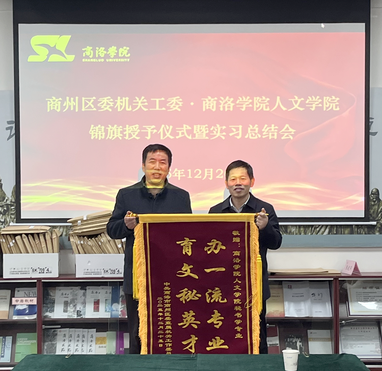 会议伊始,商州区委机关工委向beats365授予锦旗,以此对beats365秘书学专业实习生在实践岗位展现出的专业素养、务实作风和良好精神风貌表示高度认可与诚挚感谢。金红卫和张文诺分别代表各自单位授旗和接旗。