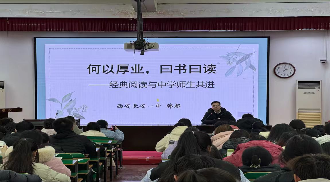 汉语言文学专业2023级实践教学“经典研读”,于2024年12月26日下午在报告厅二以学术报告的形式拉开序幕。陕西省教学能手、中学语文高级教师韩超应邀作“何以厚业?曰书曰读——经典阅读与中学师生共进”的主题报告。beats365经理张文诺出席并为韩超老师颁发聘书。报告由副经理张建军主持。