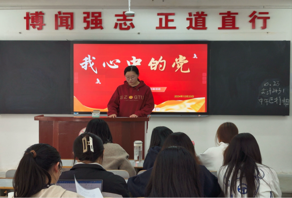 党员袁铭、马梅梅等同学依次上台,分享了她们对党的认识与感悟。袁铭同学认为,中国共产党就是一座灯塔,她的存在让我看到了希望,感受到了温暖,也教会了我什么是真正的良心。每当我遇到困惑或挫折,想到那些在历史上留下浓墨重彩一笔的共产党人,就会感受到一股巨大无形的力量,激励我继续前进。马梅梅同学表示,新时代的广大青年要自觉担负起时代的重任,不惧风雨、勇挑重担,在为人民服务中茁壮成长,在艰苦奋斗中砥砺意志品质、在实践中增长工作本领,在时代的征程中不懈奋进,在祖国的万里长空放飞梦想,在为人民利益的奋斗中书写人生华章!