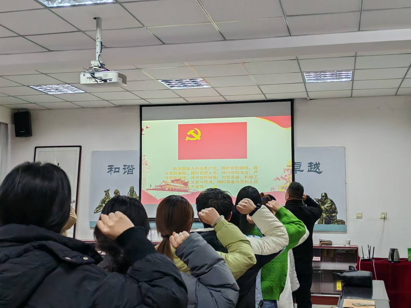在领誓人郝东的带领下,新党员们庄重地举起右拳,那紧握的拳头仿佛凝聚着他们对党的无限忠诚与坚定信念。她们齐声宣誓:“我志愿加入中国共产党,拥护党的纲领,遵守党的章程,履行党员义务,执行党的决定,严守党的纪律,保守党的秘密,对党忠诚,积极工作,为共产主义奋斗终身,随时准备为党和人民牺牲一切,永不叛党。”誓言铮铮,响彻整个会议室,每一个音节都透露出他们内心深处的赤诚,每一句誓词都彰显着他们为党的事业奉献一切的决心。这一刻,他们正式成为了党组织光荣的一员,肩负起了时代赋予的神圣使命。